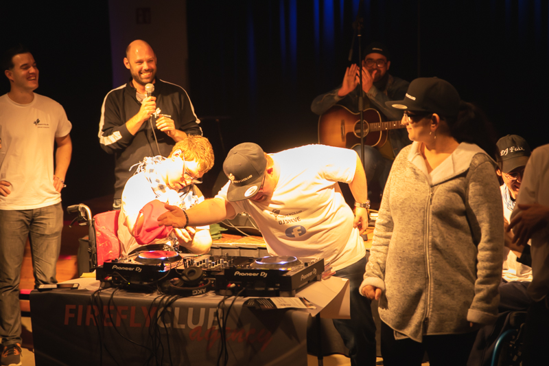 Was Du vermutlich nicht gleich bemerkst: Der DJ an den Turntables ist Autist. Die DJane, die gleich als Nächste spielt, lebt mit dem Downsyndrom und freut sich auf ihr Set. Die Beats jagen Dich durch die Nacht und Du erlebst hautnah, wie Musik verbindet.